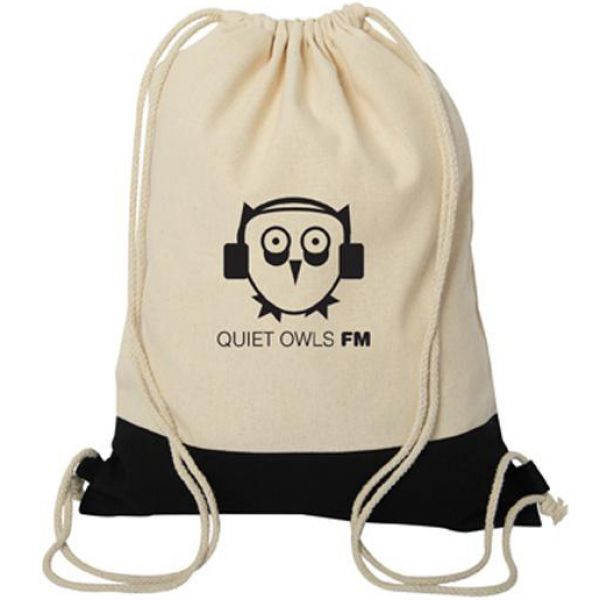 8 oz. Cotton. Natural Cotton double cords that act as drawstring closure and straps for backpack. Top 2/3 of all bags are Natural coloured. Large cinch bag is great to show off your logo. Get maximum exposure and value! Your choice of coloured bottom. Price includes one colour, one location imprint.