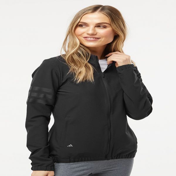 7.2 oz./yd2 (US), 12 oz/L yd (CA), 94/6 recycled polyester/elastane plain weave. Durable water-repellent finish. Soft shell stretch fabric. Half elastic cuffs. Two front zip pockets. 3-stripes on right arm. Contrast colour adidas performance logo on right hip. Price includes embroidery.