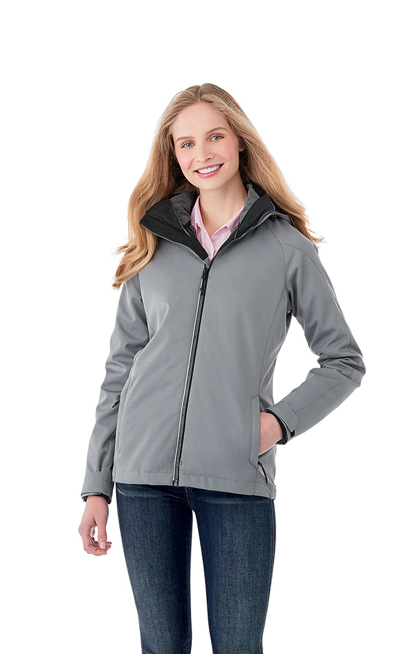 The Women's Arlington 3-in-1 Jacket will have you ready for any weather with a breathable, waterproof outer shell and a detachable heathered microfleece liner jacket. The outer shell has added convenience features like easy grip zipper pulls, a detachable hood and elastic drawcords at the hem, while the liner jacket features bonus details like an interior media pocket and cord guide to keep your devices handy. The women's version has shaped seams and a tapered waist for a flattering fit. FABRIC: OUTERSHELL: 100% Polyester mechanical stretch woven with waterproof (3000mm), breathable (500g/m2) membrane and water repellent finish, 220 g/m2 (6.5 oz/yd2). DETACHABLE JACKET: 100% Polyester anti-pill heather microfleece, 176 g/m2 (5.2 oz/yd2). Price includes embroidery.