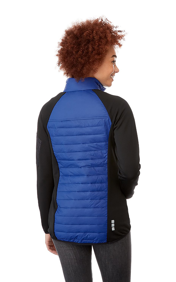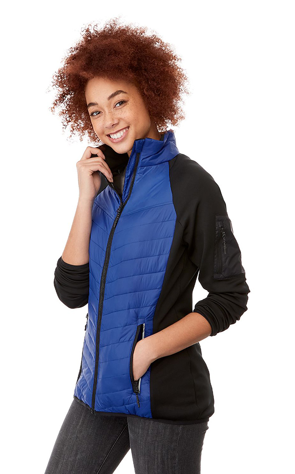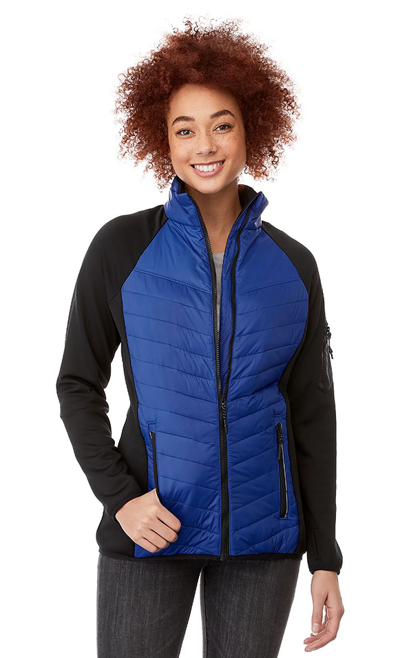 With its distinctive quilted body, brushed back knit sleeves and body panels, the Banff Hybrid Insulated Jacket is an unique combination of style and comfort. Offering insulated warmth and a water repellent finish for work or play! It's also got brushed polyester inner zip flap, chin guard and pocket lining for the added touch of cozy. Available in bold colour-block or monochrome, the Banff has a distinctive retail look that will set any brand apart. FABRIC: OUTERSHELL: 100% Nylon dull cire 380T woven, water repellent and downproof, 38 g/m2 (1.1 oz/yd2). CONTRAST: 94% Polyester 6% Elastane anti-pill interlock brushed back with durable water repellent finish body side panels, sleeves & inner collar, 245 g/m2 (7.2 oz/yd2). LINING: 100% Polyester taffeta 210T cire finish body lining. 100% Polyester brushed tricot knit inner zipper flap, chin guard & pocket bags. INSULATION: 100% Polyester faux down fill total of body, 82 g (2.9 oz) Men's size L, 68 g (2.4 oz) Womens size M. 100% Polyester soft fill collar, 100 g/m2 (3 oz/yd2). Price includes embroidery.