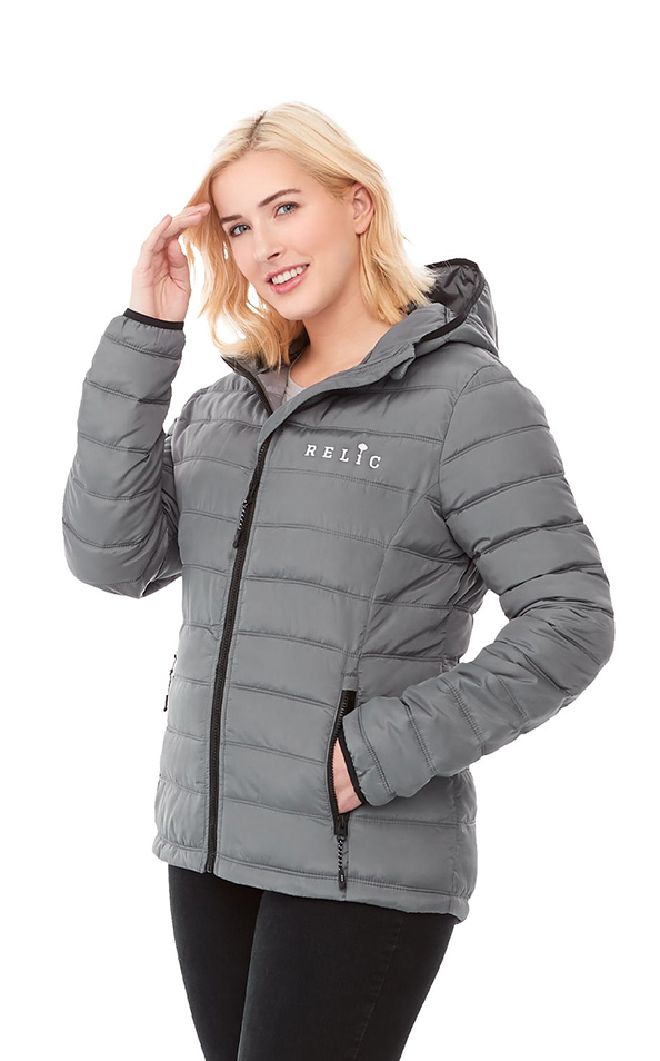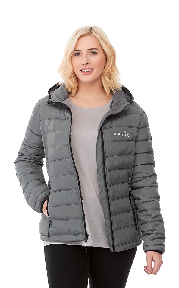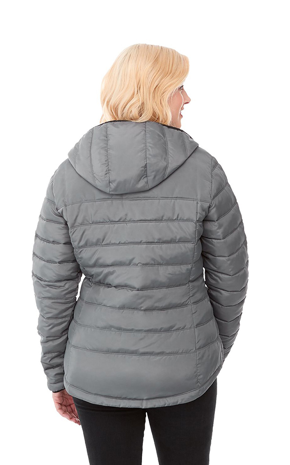 The Norquay is a stylish look for fall to winter. A combination of lightweight warmth and trendy retail styling, the Norquay provides protection from the elements with 100% polyester faux down insulation, an attached hood, interior storm flap with chin guard and water-repellent finish. It also features contrast binding on the cuffs, hem and hood opening for men's. The women's style has a dropped back hem with shaped seams and a tapered waist for a more natural fit. With its retail look and decoration-friendly back-shoulder panel, the Norquay will command attention for any brand. OUTERSHELL: 100% Polyester 290T woven with water resistant (600mm) coating and water repellent finish, 60 g/m2 (1.8 oz/yd2). LINING: 100% Polyester 290T. INSULATION: 100% Polyester faux down fill total of body, sleeves and hood, 393 g (13.9 oz) Men's size L; 321 g (11.3 oz) Womens size M. WARMTH RATING:Warmth Level 2 - Cold/Urban Winter Day (0 degrees C to -15 degrees C/ 32 degrees F to 5 degrees F)** Price includes embroidery.