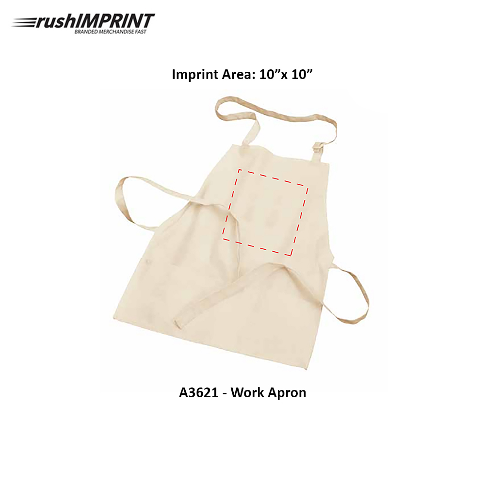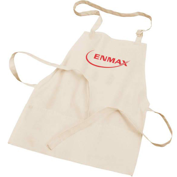 Poly Cotton 65/35. Washable (direct screen print only); non-washable for any other decorating methods. Adjustable neck ties. Extra long self-material waist ties. Three open divided pockets on bottom (6.75" W x 7.25" H). Price includes one colour, one location imprint.