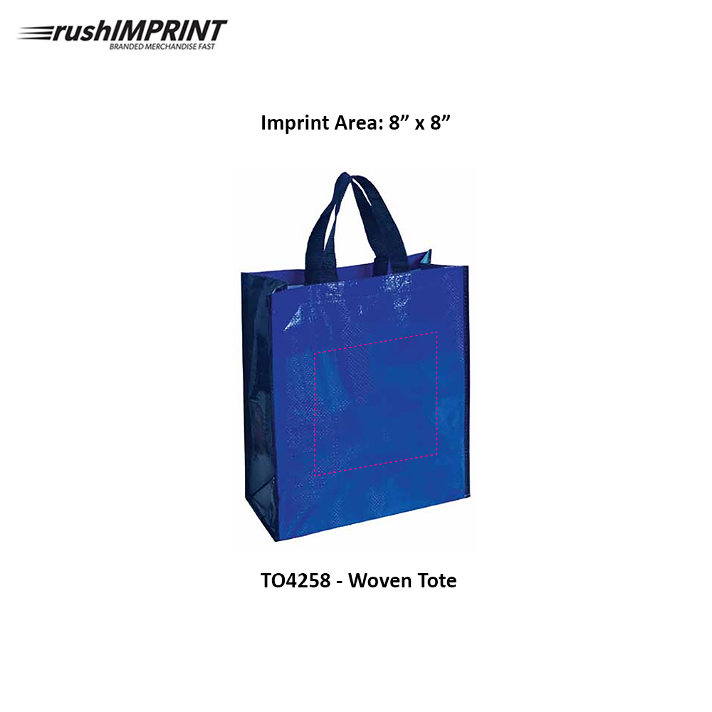 80% Recycled laminated 160 gram woven Polypropylene. Extra large gusset to carry large items. Two webbed carry handles. Keep in your trunk to reuse over and over. Save the environment. Huge imprint area that is highly visible. Inside and outside are both laminated.
